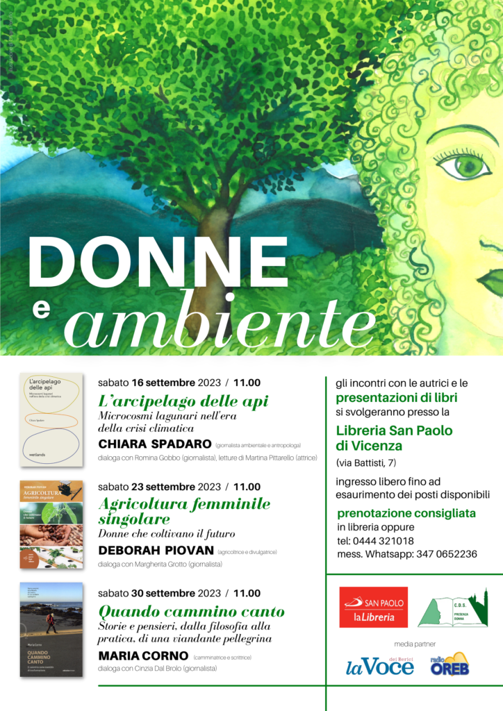 Provocati dal cambiamento climatico, nel “Tempo del creato” che è il mese di settembre, in attesa della lettura integrativa all’enciclica “Laudato Si'” dedicata da papa Francesco a temi e pratiche dell’ecologia integrale, tre presentazioni del libro ci aiuteranno ad attraversare questi temi dal punto di vista delle donne. Per tre sabati di settembre, alle 11.00 presso la Libreria San Paolo di Vicenza (via Battisti 7), si svolgerà il percorso di “Donne e ambiente”.