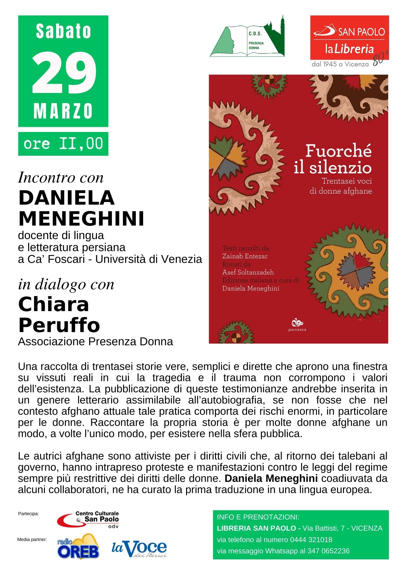 Sabato 29 marzo appuntamento alle 11.00 in Libreria San Paolo Vicenza per la presentazione del libro “Fuorché il silenzio. Trentasei voci di donne afghane”. Interviene la curatrice dell’edizione italiana Daniela Meneghini, docente di lingua e letteratura persiana a Ca’ Foscari, in dialogo con la nostra socia Chiara Peruffo.