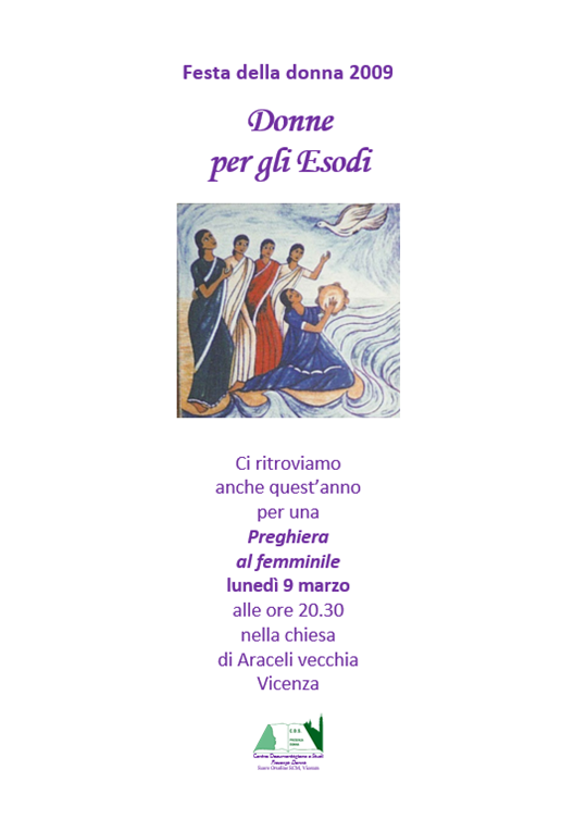 Nel decimo anno in cui viene realizzata questa preghiera, l’8 marzo 2009 ci accompagnano le donne dei primi due capitoli dell’Esodo, quelle che con le loro scelte hanno reso possibile la vita di Mosè. Ci sono presentate attraverso le meditazioni della teologa uruguayana Maria Teresa Santiso, morta nel giugno 2001, proposte in occasione della Conferenza Mondiale della donna, a Pechino, nel 1995.