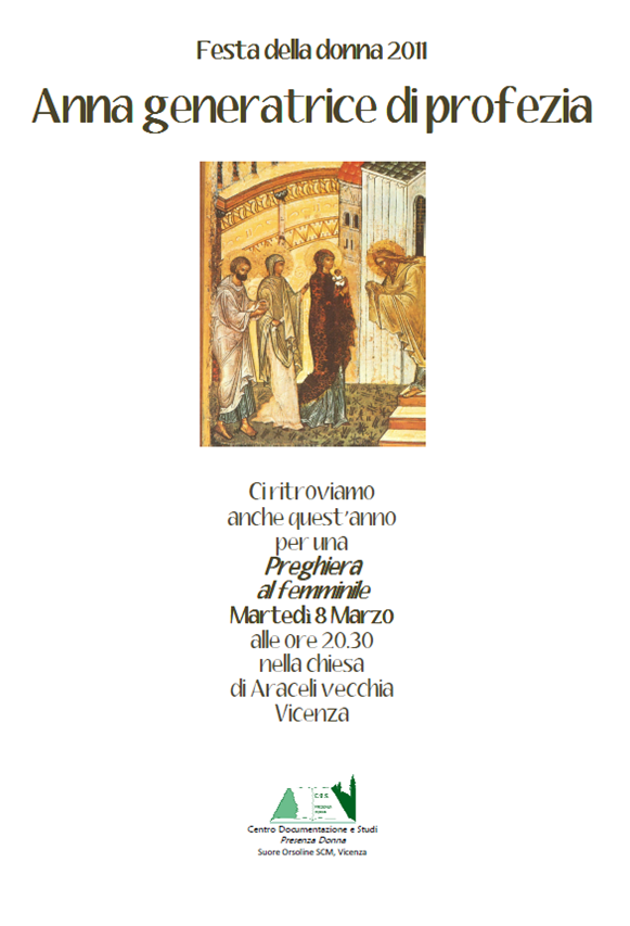 Anna generatrice di profezia è il titolo della preghiera dell’8 marzo 2011 che trae spunto dal da Lc 2,36-38. Nella serata, Ulrike Jourdan, pastora metodista, cura la riflessione e il commento alla Parola, sr Letizia Iacopucci racconta la sua esperienza di insegnante e coordinatrice di gruppi di animazione giovani e adulti.