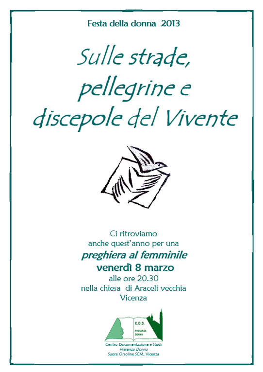 Con la preghiera dell’8 marzo 2013 ci mettiamo in cammino sulle orme di Priscilla, Egeria e S. Angela Merici per essere come loro Sulle strade, pellegrine e discepole del vivente. Le meditazioni bibliche sono curate da don Raimondo Sinibaldi, direttore dell’Ufficio pellegrinaggi diocesano, interviene portando la propria testimonianza Cristina Salviati, ex-presidente della Croce Rossa vicentina, impegnata nel servizio Caritas.
