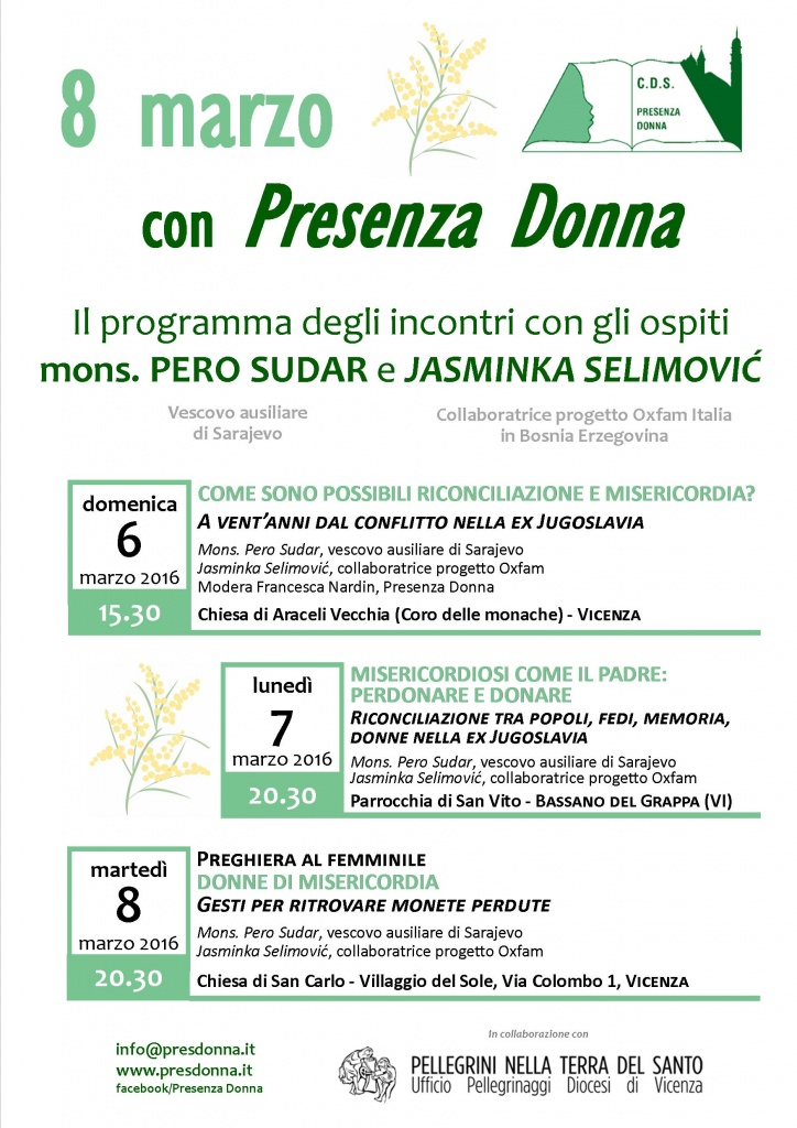 Il 6-7-8 marzo del 2016 gli incontri hanno come focus la tematica della misericordia e del riscatto, con mons. Pero Sudar, vescovo ausiliare di Sarajevo e Jasmina Selimović, collaboratrice del progetto Oxfam Italia in Bosnia Erzegovina. In particolare, la preghiera dell’8 marzo ha il titolo Donne di misericordia. Gesti per ritrovare monete perdute.