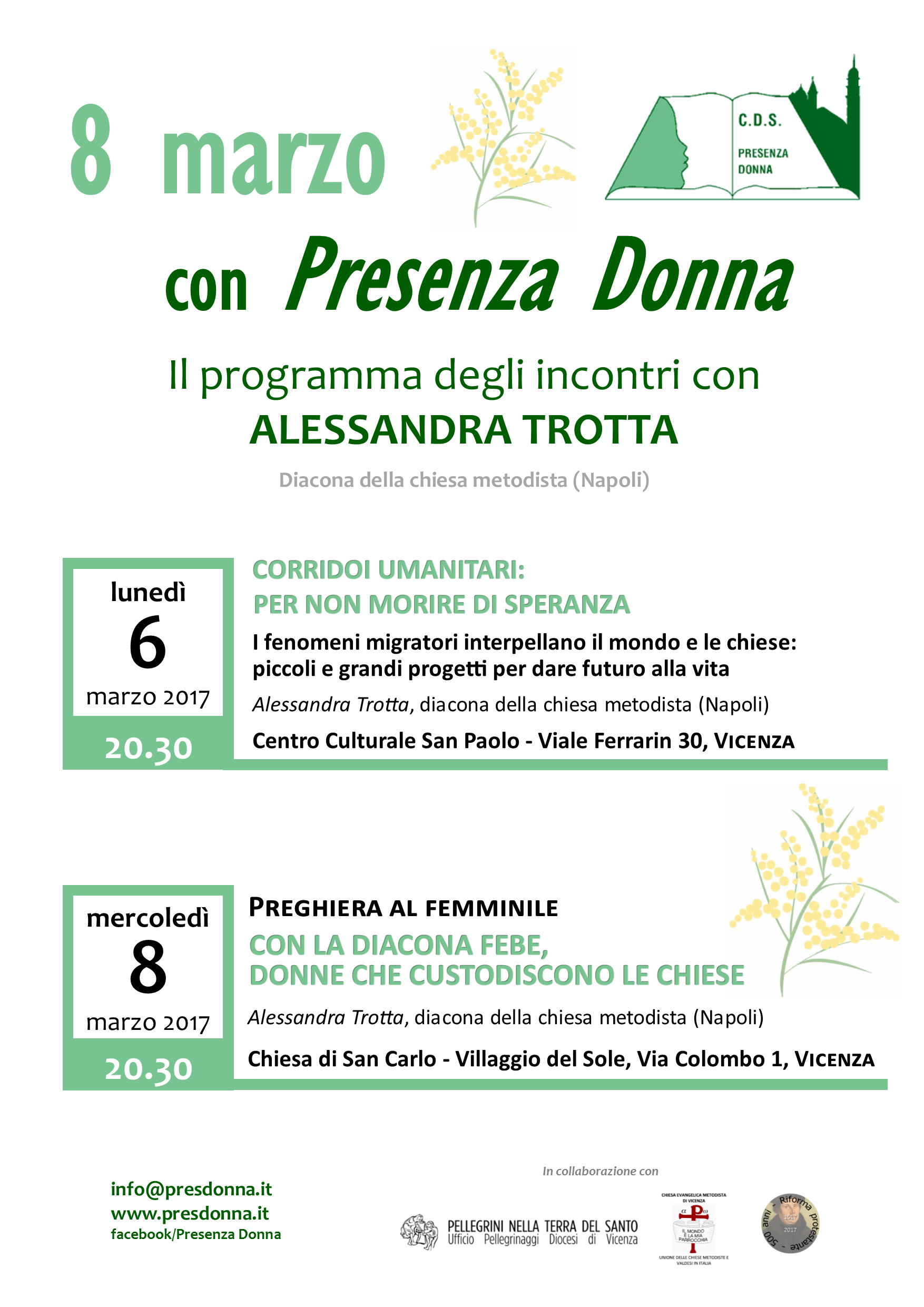 Accompagnate/i da Alessandra Trotta, diacona della chiesa metodista (Napoli), nella serata del 6 marzo 2017 riflettiamo sul tema delle migrazioni con l’incontro dal titolo Corridoi umanitari: per non morire di speranza. La sua testimonianza arricchisce anche la preghiera dell’8 marzo che ha come titolo Con la diacona Febe, donne che custodiscono le chiese.