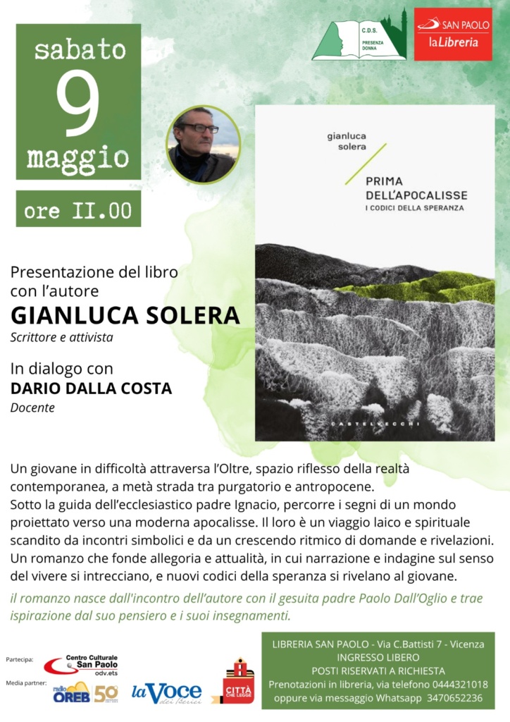 Sabato 9 maggio 2026 appuntamento alle 11.00 in Libreria San Paolo a Vicenza per la presentazione del libro “Prima dell’apocalisse. I codici della speranza”. L’autore Gianluca Solera, scrittore e attivista, dialogherà con Dario Dalla Costa.