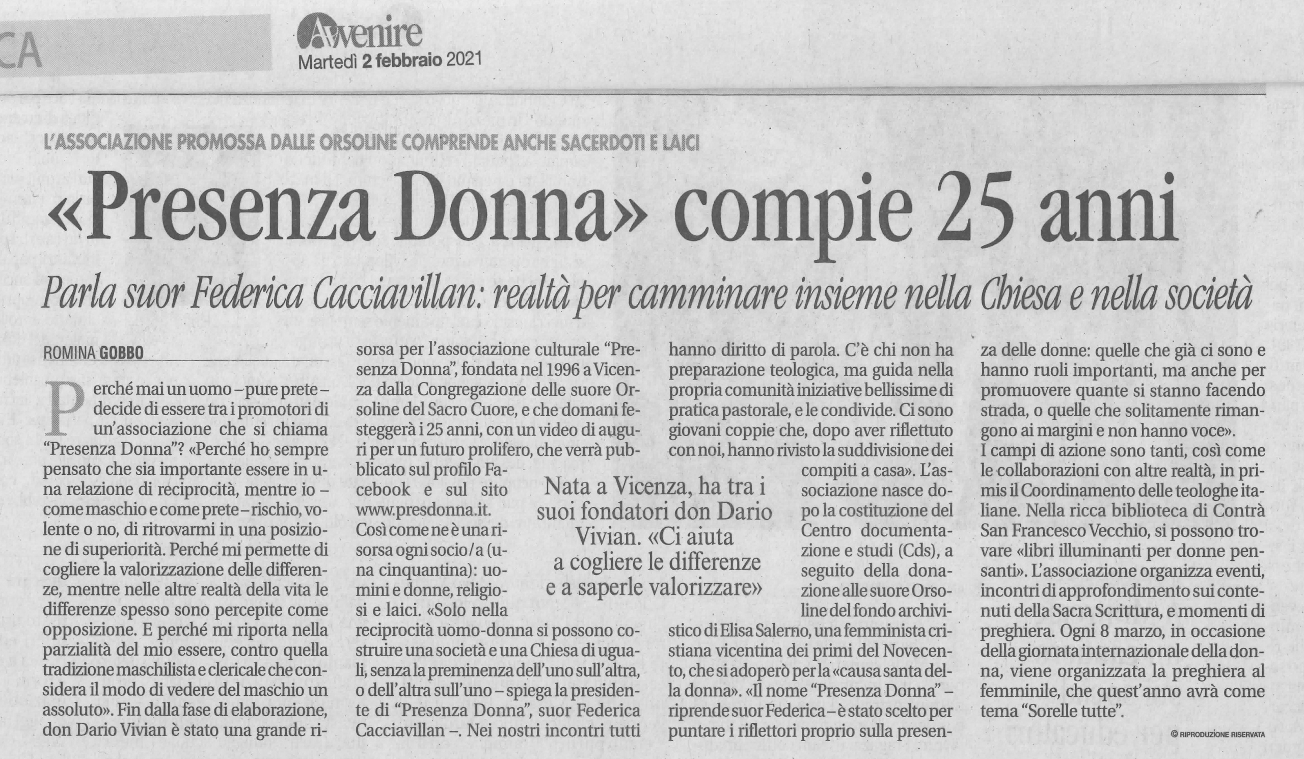 Clicca QUI per leggere l’articolo sui 25 anni di Presenza Donna realizzato da Romina Gobbo e pubblicato dal quotidiano Avvenire del 2 febbraio 2021. Buona lettura!