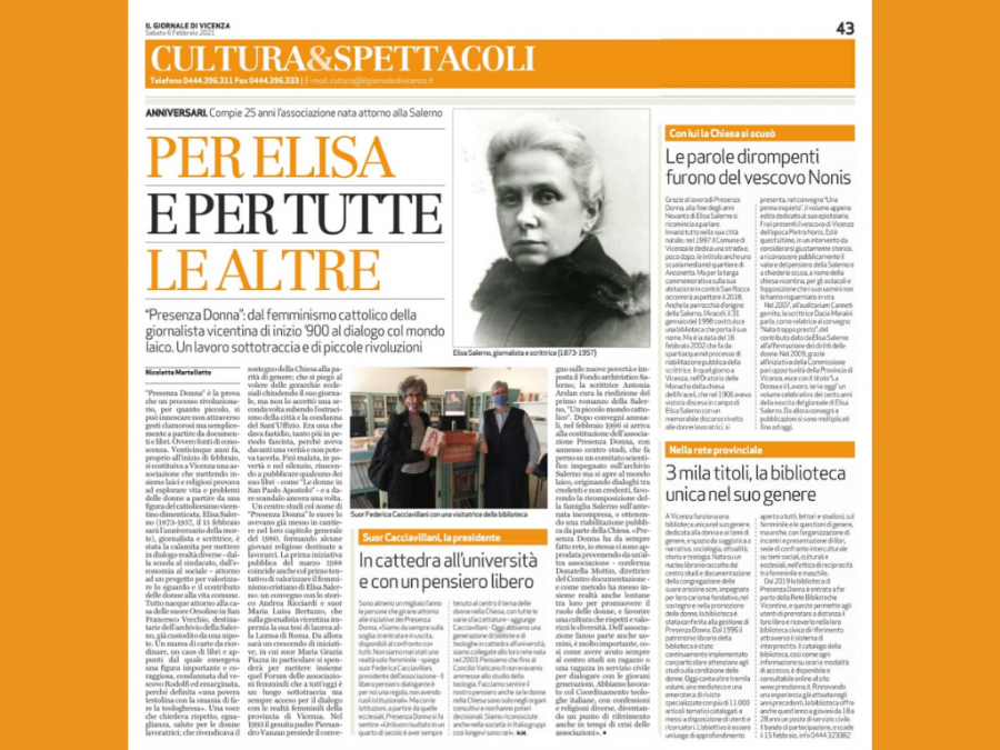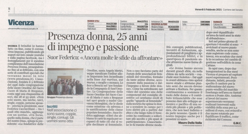 Clicca QUI per leggere l’articolo sui 25 anni di Presenza Donna realizzato da Mauro Della Valle e pubblicato dal quotidiano il Corriere del Veneto del 5 febbraio 2021.