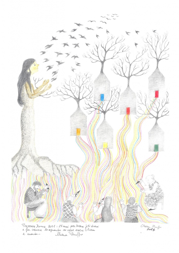 Ecco le parole di Chiara a commento dell’immagine: “Perché festeggiare i 25 anni di Presenza Donna? Perché in modo tenace questa associazione ha tessuto con pazienza tanti fili di colori e provenienze diverse, senza scartare quelli che sembravano un poco ribelli o invece silenziosamente modesti. In ogni città vi sono case ricche di un loro colore speciale, capaci anche di essere rami su cui uccelli possono sostare e fare il nido. Ma per avere il coraggio di partire verso orizzonti più ampi, questi uccelli hanno bisogno di unirsi in grandi stormi. Come i fili di ogni singola casa, che restano piste incerte fino a che non vengono raccolti e tessuti insieme, finché non mischiano i loro colori in un nuovo tessuto. Ed è solo pescando da quel lavoro silenzioso che è possibile alimentare le nostre radici e guardare finalmente gli uccelli alzarsi verso l’orizzonte“.
