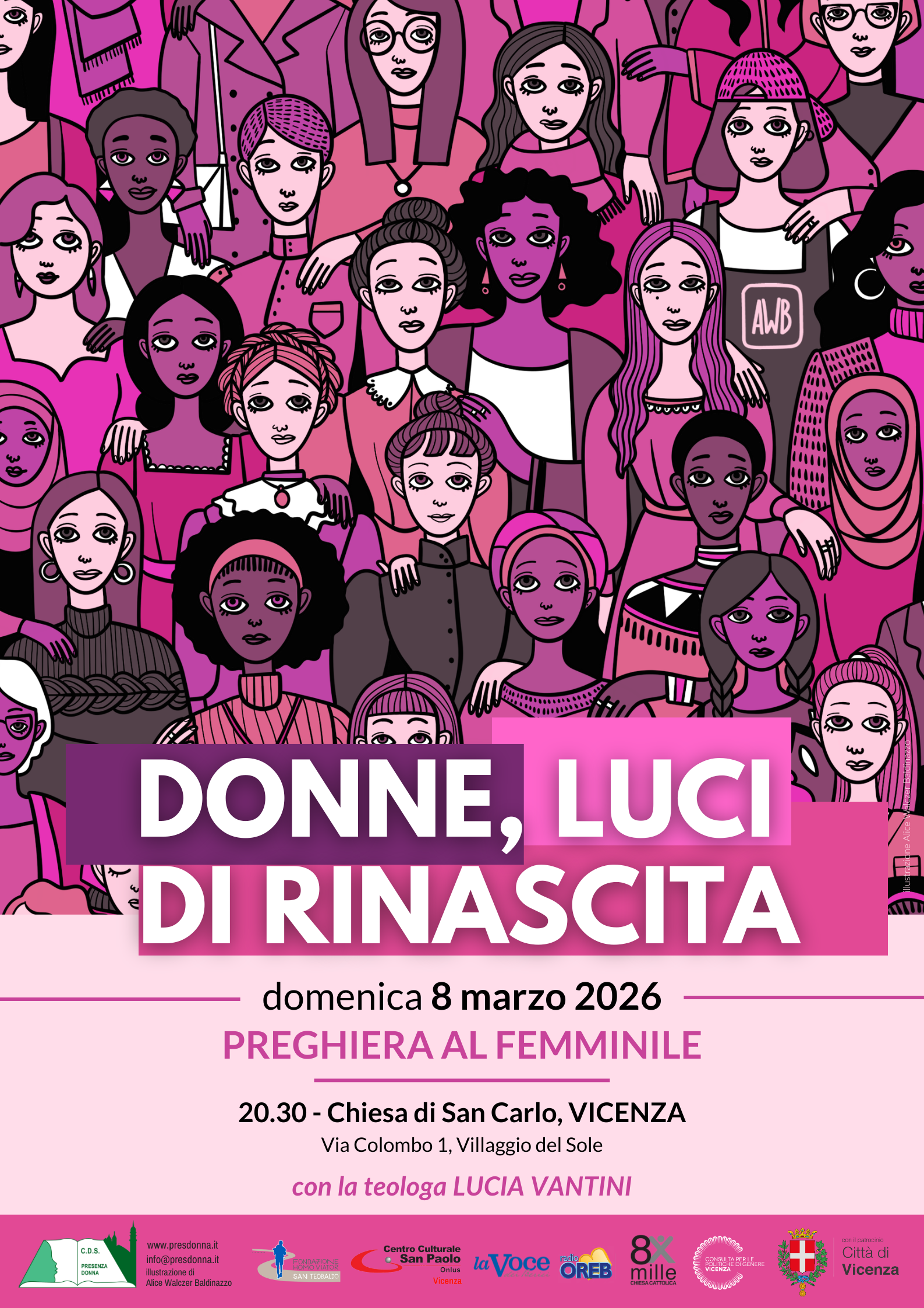 Domenica 8 marzo 2026 si rinnova il tradizionale appuntamento con la preghiera al femminile, intitolata quest’anno “Donne, luci di rinascita”, in occasione dell’8 marzo e della Giornata internazionale dei diritti della donna. La preghiera si svolgerà alle 20.30 presso la chiesa di San Carlo al Villaggio del Sole a Vicenza (via Colombo 1).