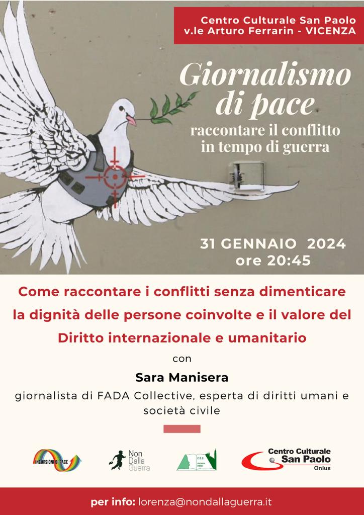 “Giornalismo di pace. Raccontare il conflitto in tempo di guerra”. Questo il titolo dell’incontro in programma mercoledì 31 gennaio alle 20.45 al Centro Culturale San Paolo di viale Arturo Ferrarin a Vicenza.