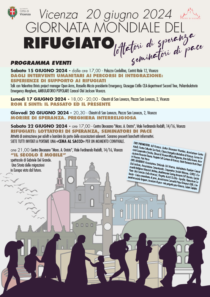 In occasione della Giornata mondiale del rifugiato che si celebra il 20 giugno, Vicenza sarà animata da un ricco programma di attività. Con il patrocinio della diocesi e del comune, tra enti promotori ed enti aderenti si conta una rete di oltre 25 realtà unite dal desiderio di promuovere una riflessione ed una sensibilizzazione sul tema migratorio. La Giornata mondiale è un’opportunità per riflettere sulla tutela dei diritti umani per tutti, e sulle vie da percorrere insieme per costruire una società davvero libera e aperta alle differenze, capace di riconoscere e rispettare la diversità.