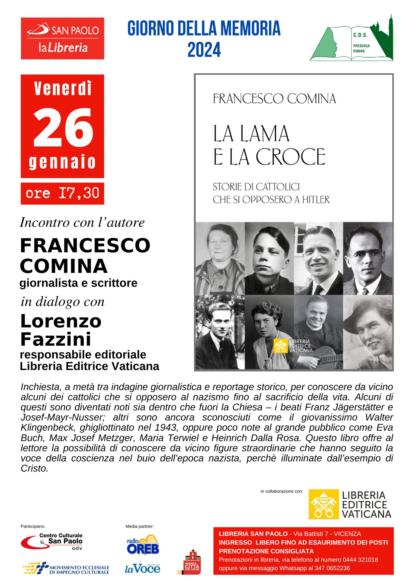 Venerdì 26 gennaio alle 17.30, in occasione del Giorno della memoria, il giornalista Francesco Comina presenterà il suo “La lama e la croce. Storie di cattolici che si opposero a Hitler” in dialogo con Lorenzo Fazzini, responsabile editoriale LEV.