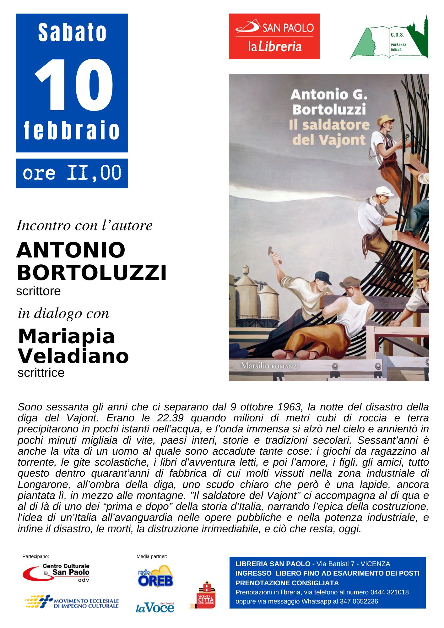 Sabato 10 febbraio alle 11.00 lo scrittore Antonio Bortoluzzi presenterà invece il suo nuovo romanzo “Il saldatore del Vajont”, in dialogo con la scrittrice Mariapia Veladiano.