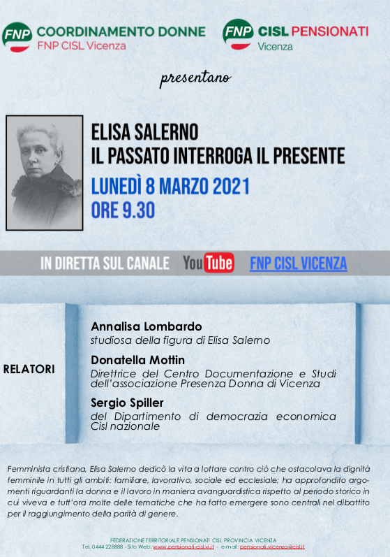 Lunedì 8 marzo 2021 alle 9.30, in diretta sul canale YouTube FNP CISL Vicenza, si terrà un incontro di approfondimento dal titolo “Elisa Salerno: il passato interroga il presente”.
