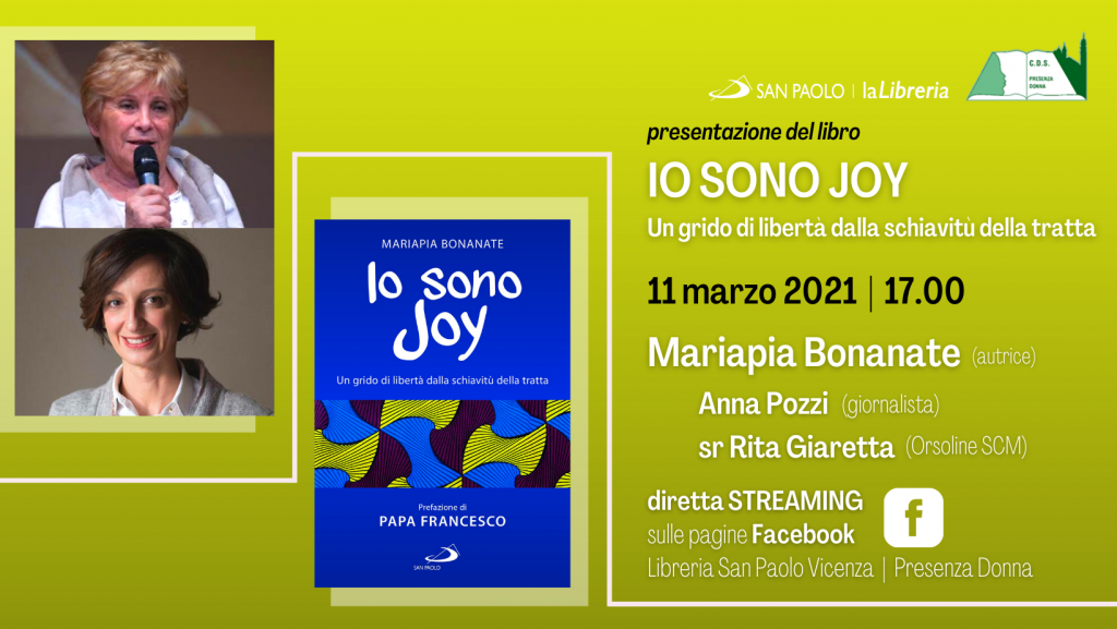 La presentazione del libro “Io sono Joy. Un grido di libertà dalla schiavitù della tratta” (ed. San Paolo), proposta da associazione Presenza Donna e Libreria San Paolo di Vicenza in occasione della giornata mondiale di preghiera e riflessione contro la tratta di persone e che era stata rinviata per motivi tecnici, si svolgerà giovedì 11 marzo alle 17.00 in diretta streaming sulle pagine Facebook di Libreria San Paolo Vicenza e Presenza Donna.