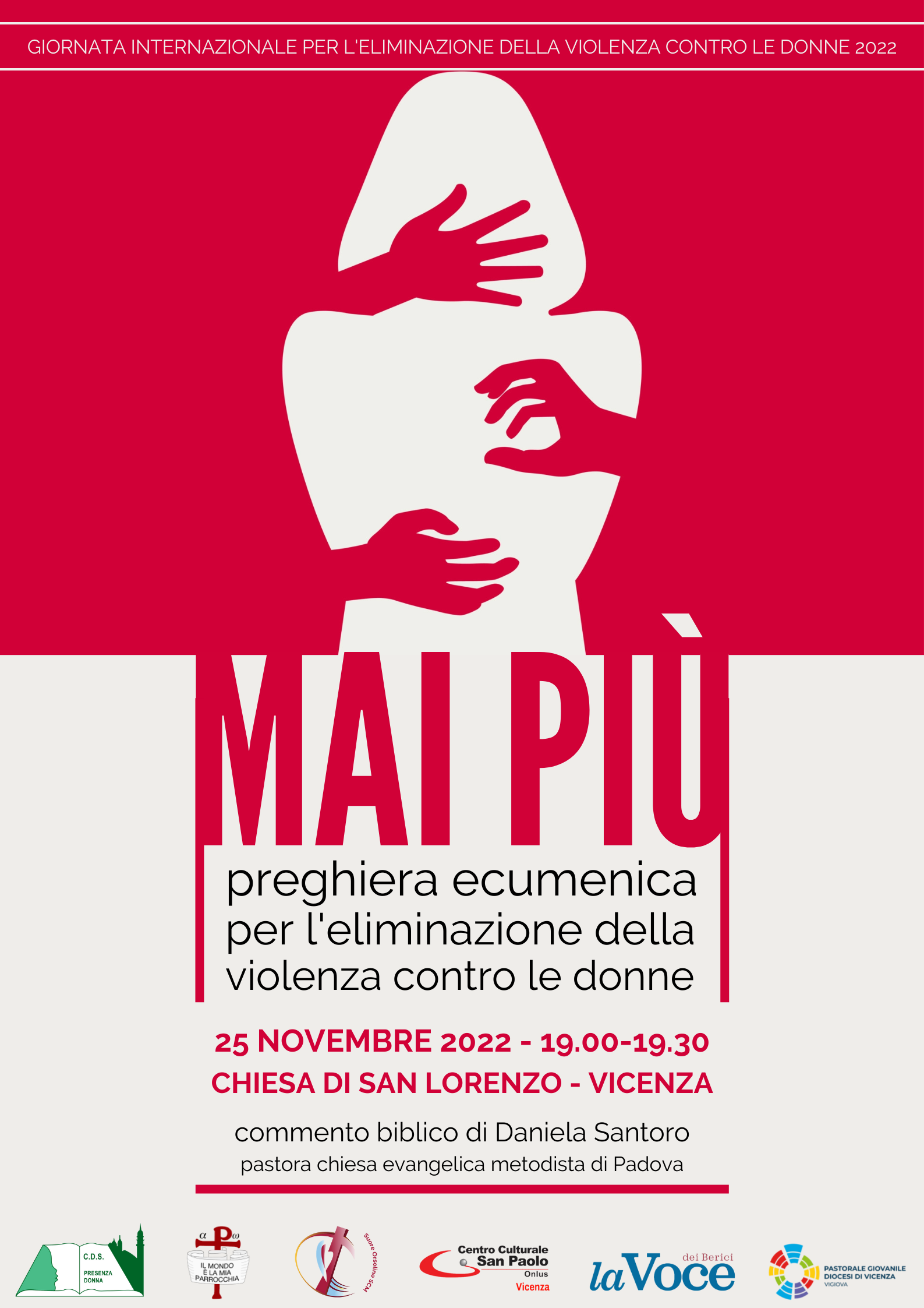Venerdì 25 novembre 2022, in occasione della Giornata internazionale per l’eliminazione della violenza contro le donne, vi diamo appuntamento alle 19.00 presso la chiesa di San Lorenzo a Vicenza per “MAI PIÙ”, un momento di preghiera ecumenica per l’eliminazione della violenza contro le donne.