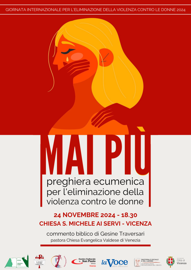 Domenica 24 novembre 2024, in occasione della Giornata internazionale per l’eliminazione della violenza contro le donne, vi diamo appuntamento alle 18.30 presso la chiesa di San Michele ai Servi a Vicenza per “MAI PIÙ”, un momento di preghiera ecumenica per l’eliminazione della violenza contro le donne.