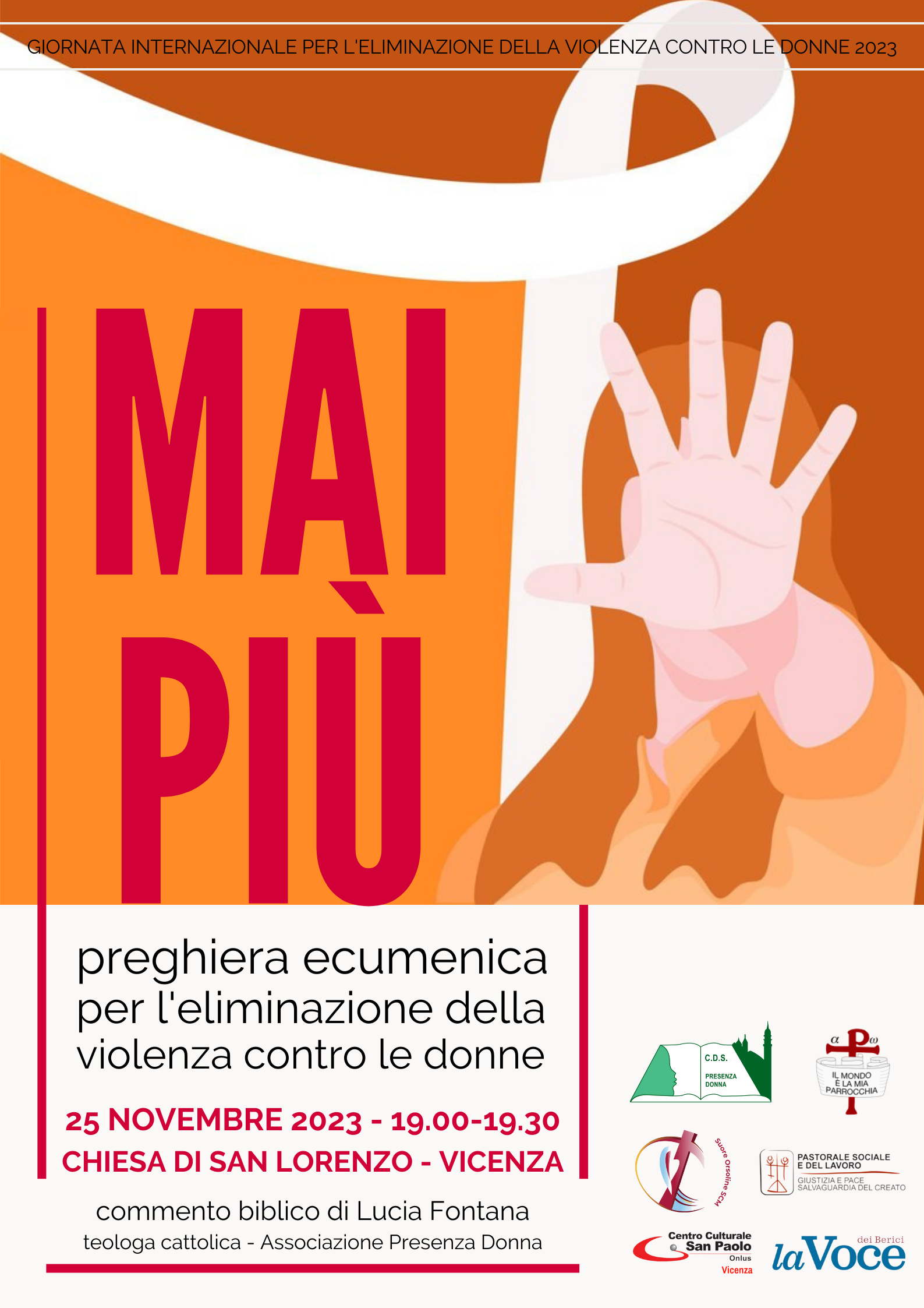 Sabato 25 novembre 2023, in occasione della Giornata internazionale per l’eliminazione della violenza contro le donne, vi diamo appuntamento alle 19.00 presso la chiesa di San Lorenzo a Vicenza per “MAI PIÙ”, un momento di preghiera ecumenica per l’eliminazione della violenza contro le donne.