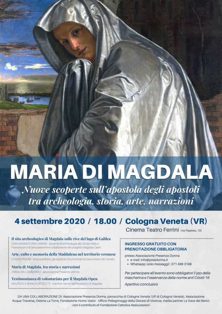 Venerdì 4 settembre 2020 alle ore 18.00 si terrà presso il Cinema Teatro Ferrini di Cologna Veneta (via Papesso, 10) l’incontro interdisciplinare di approfondimento “Maria di Magdala. Nuove scoperte sull’apostola degli apostoli tra archeologia, storia, arte, narrazioni”. L’evento offrirà un’interessante, aggiornata e competente panoramica sulla figura di Maria di Magdala a partire da diverse prospettive disciplinari, come mostra il programma degli interventi di relatori e relatrici ospiti.