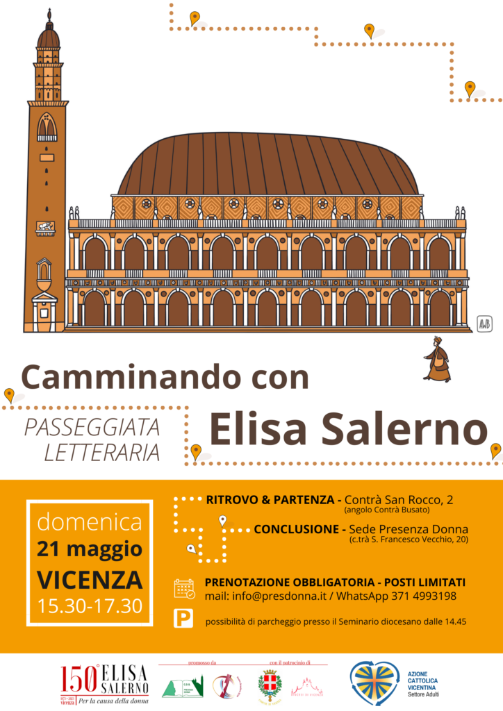 “Camminando con Elisa Salerno” è il titolo è il titolo dell’evento che avrà luogo a Vicenza nel pomeriggio di domenica 21 maggio. Si tratta di una passeggiata letteraria dedicata ad Elisa Salerno, per conoscere la sua vita e i suoi scritti passando dai luoghi della città in cui ha vissuto e operato, mettendosi in ascolto delle sue parole.