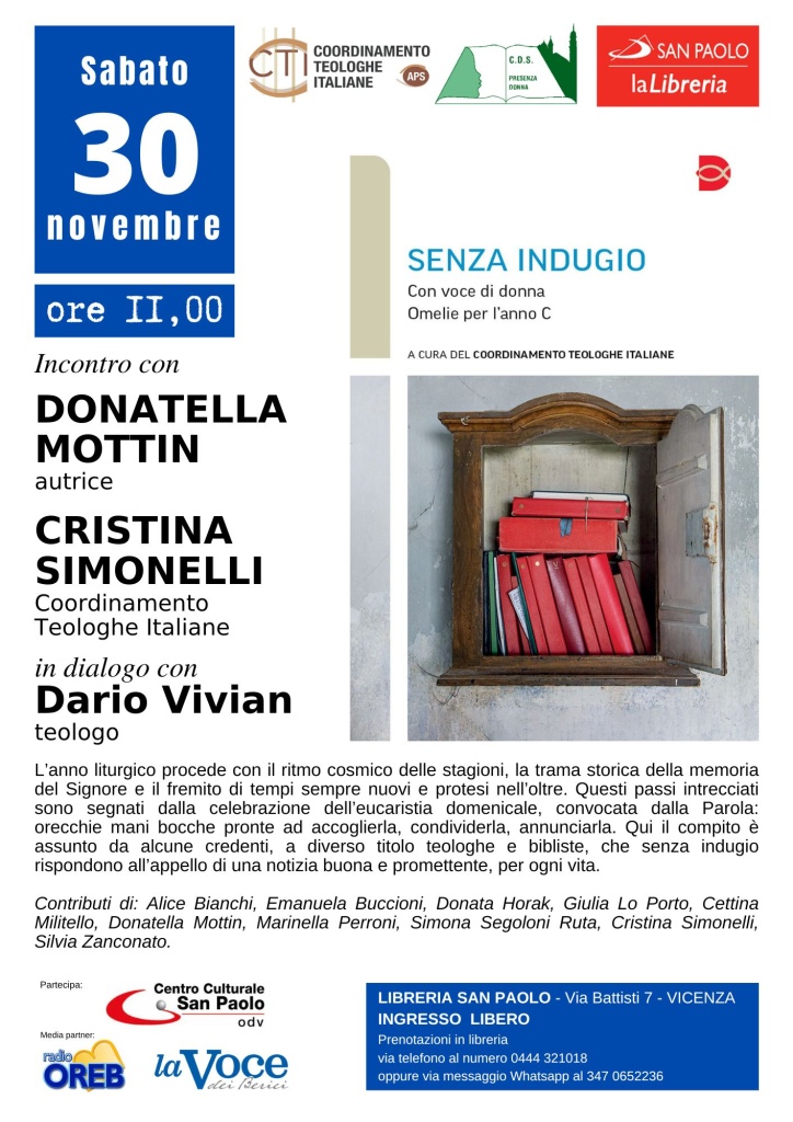 Sabato 30 novembre, in occasione dell’inizio del nuovo anno liturgico, appuntamento alle 11.00 presso la Libreria San Paolo di Vicenza per la presentazione di “Senza indugio. Con voce di donna – Omelie per l’anno C”.
