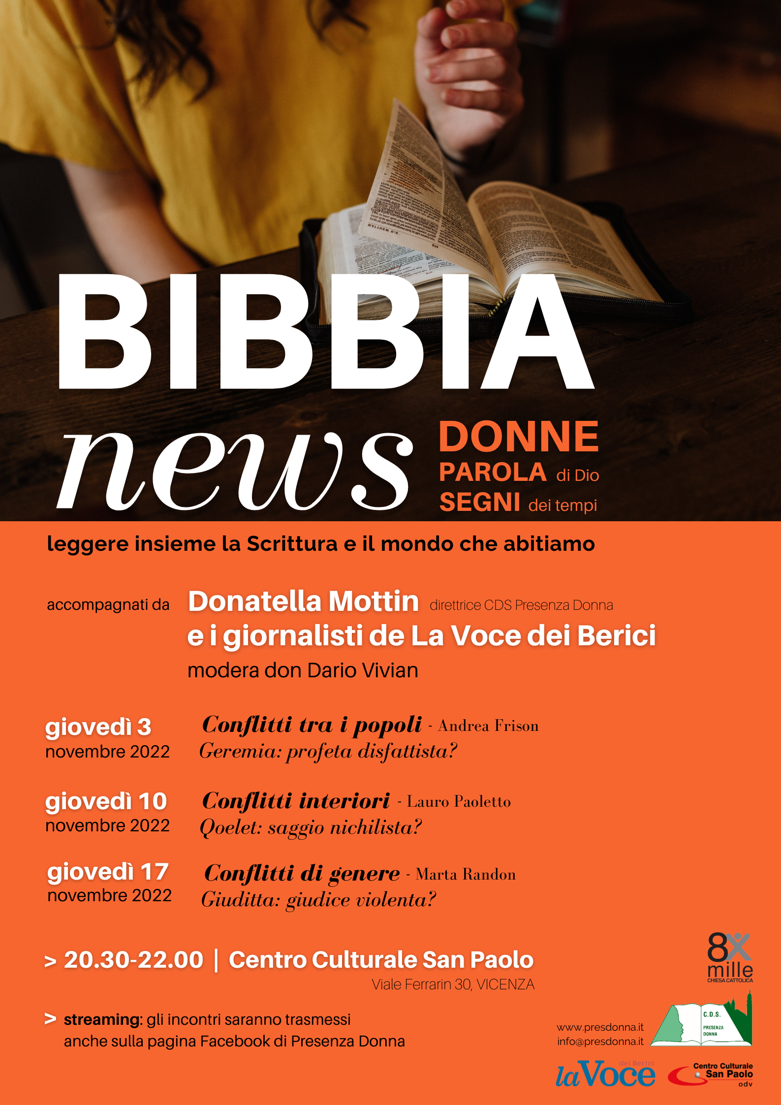 Sta per iniziare un nuovo percorso di “Bibbia News. Donne, parola di Dio e segni dei tempi”, la proposta di Presenza Donna per leggere insieme la Scrittura e il mondo che oggi abitiamo, all’insegna del confronto e della condivisione. L’iniziativa si svilupperà nell’arco di tre incontri, giovedì 3, 10 e 17 novembre 2022, e secondo una particolare modalità di approccio al testo biblico e all’ordinarietà di ciò che viviamo. Interpellate e interpellati dalla realtà, come credenti che in una mano tengono la Bibbia e nell’altra il giornale, per rimandare alla celebre immagine di Karl Barth.
