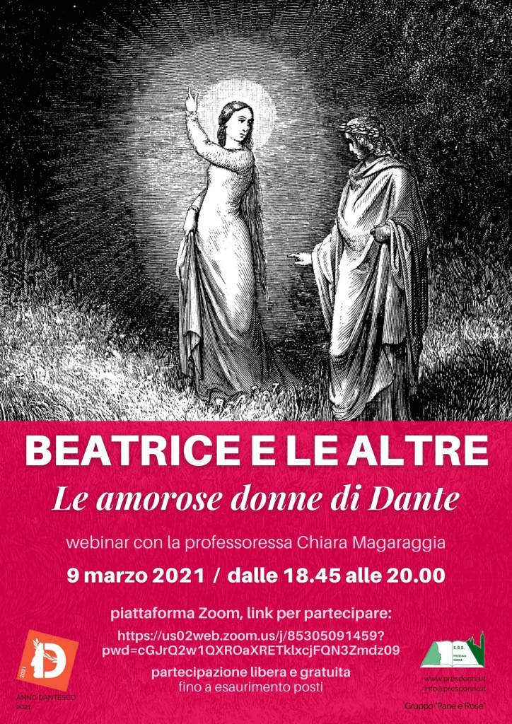Per proseguire la celebrazione della Giornata internazionale dei diritti della donna e in occasione dell’anno dantesco, martedì 9 marzo 2021 vi proponiamo il webinar “Beatrice e le altre. Le amorose donne di Dante”.
